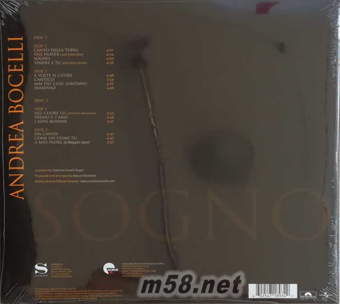 Tracks on Disc 1: 1. Canto Della Terra (Side A) 2. The Prayer (duet with Celine Dion) (Side A) 3. Sogno (Side A) 4. O Mare E Tu (duet with Dulce Pontes) (Side A) 5. A Volte Il Cuore (Side B) 6. Cantico (Side B) 7. Mai Piu' Cosi' Lontano (Side B) 8. Immenso (Side B) Tracks on Disc 2: 1. Nel Cuore Lei (duet with Eros Ramazzotti) (Side A) 2. Tremo E T'Amo (Side A) 3. I Love Rossini (Side A) 4. Un Canto (Side B) 5. Come Un Fiume Tu (Side B) 6. A Mio Padre (Side B)