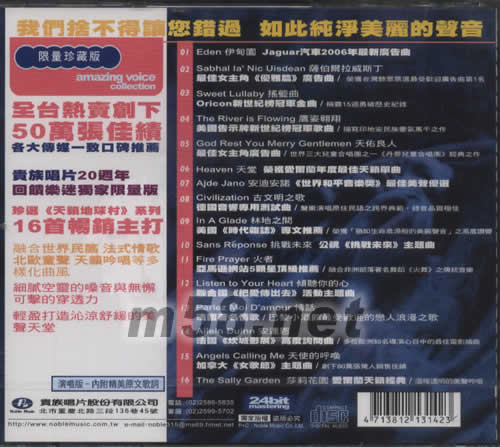 天籟地球村最優選(限量珍藏版)(m58.net) 16首全球 新世紀美聲排行榜 暢銷主打 JAGUAR汽東2006年 最新廣告曲EDEN(伊甸園) 獨家推薦 法國著名流行情歌 PARLEZ MOI D'AMOUR(情話) 我們舍不得讓您錯過 如此純凈美麗的聲音 全臺熱賣創下50萬張佳績 各大傳媒一致口碑推薦 貴族唱片20周年回饋樂迷獨家限量版 珍選《天籟地球村》系列16首暢銷主打 融合世界民謠 法式情歌 北歐童聲 天籟吟唱等多樣化曲風 細膩空靈的嗓音與無懈可擊的穿透力 輕盈打造沁涼舒緩的美聲天堂