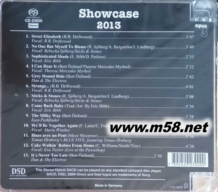 OPUS 3 作品 2013年度精選 混合層立體聲 Showcase 2013 SACD Hybrid Stereo SACD(m58.net) 世界知名發(fā)燒品牌Opus 3 Records Showcase精選專輯,選輯多位實力派歌手及樂手分別演繹多首精彩作品,從男聲到女聲,吉他到爵士,以不同角度來測試自家器材,透徹認識不同音樂特性.