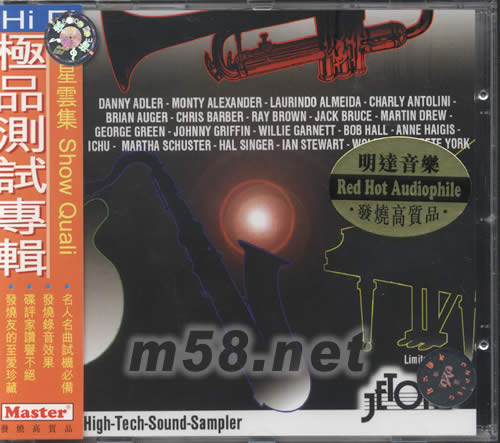 Hi Fi極品測試專輯試音必備大碟(m58.net) 著名發(fā)燒品牌JET ON一張群星云集試音正碟,專輯多首發(fā)燒名曲,龐大陣容CHARLY ANTOLINI,RAY BROWN,LAURINDO ALMEIDA及MARTIN DREW等,內(nèi)容廣泛,部分錄音早已被CD圣經(jīng)推薦,單聽鼓皇CHARLY ANTOLINI名曲‘KNOCK OUT’,牛筋皇RAY BROWN名曲‘MOOLIGHT SONATA’已完全投擇,還有MONTY ALEXANDER一財‘SONG FOR SUSAN’鋼琴獨奏,琴音晶瑩通透,女歌手ANNE HAIGIS 主題名曲‘STILL FUN’悅耳動聽,發(fā)燒友的至愛珍藏。
