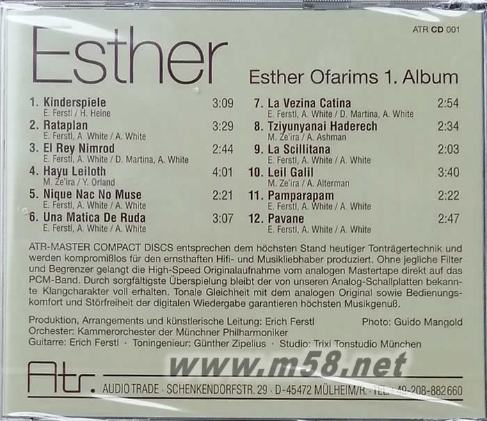 本專輯《Esther》是由德國(guó)ATR公司于1972年所出版的錄音,由大眼妹Esther Ofarims 主唱,當(dāng)年的確是發(fā)燒友人手一張 LP 或 CD做為人聲試音之用,Esther她以德文、拉丁、法文、土耳其、意大利和希伯來唱出很多國(guó)家的民謠,比如說Rataplan這是根據(jù)法國(guó)民謠改編的歌曲,敘述著國(guó)王追求臣屬之婦的過程.....;Hayu Leiloth這首歌是希伯來文,描述一對(duì)猶太情人,在埃及相戀的過程中,雖然雙方發(fā)誓要同生共死,但是有一天男方被征召去服勞役之后再也沒有看過他了,女生悲傷之余不禁問著蒼天.....;Nique Nac No Muse這是法文歌,藉以表達(dá)對(duì)繆斯女神的贊嘆,繆斯女神是希臘神話中,九位掌管詩(shī)詞、歌曲、舞蹈、歷史等女神的稱呼,一般也作為對(duì)詩(shī)人的雅稱;La Scillitana這是意大利歌謠.......。