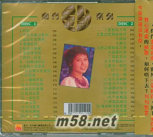 DISC 1 01. 秋歌 02. 今夜身邊沒有你 03. 最后的夜快車 04. 瀟瀟夜雨 05. 踩在夕陽里 06. 葡萄成熟時 07. 跟你一起走 08. 一封難回的信 09. 那個人就是我 10. 自從那天你走后 11. 彩云飛 12. 一縷相思情 13. 淡淡的情愁 14. 娃娃的故事 15. 我問白云 16. 一朵好花 17. 落花淚 18. 句句誓言 19. 祝你順風 20. 我心深處 DISC 2 01. 愛我在今宵 02. 夏日假期玫瑰花 03. 尋找 04. 向往 05. 野花那有家花香 06. 真真的愛 07. 真真愛你 08. 世界真細小 09. 難忘一夜情 10. 十一哥 11. 多看一眼 12. 雁兒在林梢 13. 星月不分離 14. 尋夢的孩子 15. 姑娘的酒窩 16. 千言萬語 17. 教我認識你 18. 滴滴眼淚都是愛 19. 在這里 20. 請你放開我