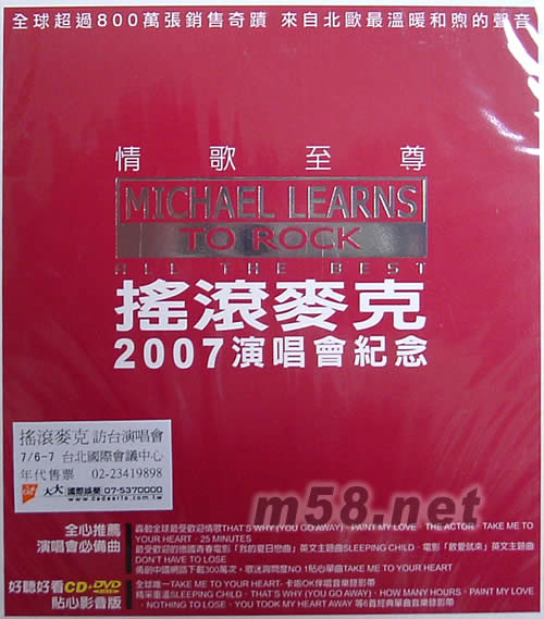 價格為估,以實到貨為準! 情歌至尊2007演唱會紀念CD+DVD(m58.net) ◎全球800萬張銷售奇蹟 來自北歐最溫暖和煦的聲音 ◎情歌至尊 闊別11年 ◎17首演唱會必備CD + 7首最愛MV DVD紀念特典盤 全心推薦演唱會必備曲: ◎轟動全球最受歡迎情歌THAT’S WHY (YOU GO AWAY).PAINT MY LOVE.THE ACTOR.TAKE ME TO YOUR HEART.25 MINUTES... ◎最受歡迎的德國青春電影「我的夏日戀曲」英文主題曲SLEEPING CHILD.電影「敢愛就來」英文主題曲DON’T HAVE TO LOSE ◎勇創中國網路下載300萬次,歌迷詢問度NO.1貼心單曲TAKE ME TO YOUR HEART ◎好聽好看 CD+DVD貼心影音版 ◎全球唯一TAKE ME TO YOUR HEART- 卡啦OK伴唱音樂錄影帶 ◎精采重溫SLEEPING CHILD.THAT’S WHY (YOU GO AWAY).HOW MANY HOURS.PAINT MY LOVE .NOTHING TO LOSE.YOU TOOK MY HEART AWAY 等6首經典單曲音樂錄影帶 細數過去的20個年頭,每一個動人時刻,都有搖滾麥克的溫暖歌聲。曾被形容是斯堪地那維亞音樂傳統與西洋流行樂的甜美相遇的搖滾麥克,在們深入流行音樂情感層面并從中精確掌握音符組構成果的能力,使得他們成為丹麥流行音樂史上最成功的團體之一。搖滾麥克在家鄉已經有超過五十萬張唱片的銷售紀錄,但更驚人的是他們在全球的銷售數字更是超過800萬張!其中更在亞洲更是掀起一陣流行狂潮。睽違12年,搖滾麥克即將在2007年再度登陸臺灣,這是他們繼1995年訪臺之后的第二度來臺,也是他們在臺灣的第一次的大型售票演唱會。 在這張精選專輯All The Best中,集合了The Actor、25 Minutes、That’s Why (You Go Away)、Someday、Paint My Love、I’m Gonna Be Around、Nothing To Lose、You Took My Heart Away、The Ghost Of You、Don’t Have To Lose、Sleeping Child及翻唱自張學友國語經典「吻別」而創下中國超過300萬次的網路下載紀錄的奇蹟單曲Take Me To Your Heart等樂壇17首最受膾炙人口的經典作品。另外為回饋所有歌迷對他們的期待,他們也首次將7首最受歡迎的單曲音樂錄影帶集結成DVD,其中的Take Me To Your Heart更有Karaoke的伴唱功能。自然純情的歌聲始終如一,沒有激情吶喊,只有詞簡情深的愛戀告白,這正是搖滾麥克最迷人的地方。
