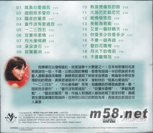 萬分君采1(m58.net) 包娜娜在臺灣相當(dāng)紅,她是遠(yuǎn)東十大歌星之一,在本地歌壇知名度稍微遜色一些,不過,以前出版的專輯,都會有超過一半的歌曲被本地藝人選唱灌錄成專輯。黃曉君就選唱了她很多歌曲,無論是快歌或是慢節(jié)拍的歌曲,黃曉君灌唱得不亦樂乎。像輕快的"誰真心愛過我","一二三四五","月光像情網(wǎng)"等等。包娜娜的抒情歌曲更捧,像"證明我多愛你","當(dāng)作沒有愛過我","寂寞伴柔情","長發(fā)為君剪","臨走的誓言"等。作曲人和填詞人都為她寫了很多好歌,黃曉君在選包娜娜的歌曲時,也特別以自己的歌路為準(zhǔn),黃曉君的表現(xiàn)也令人滿意。