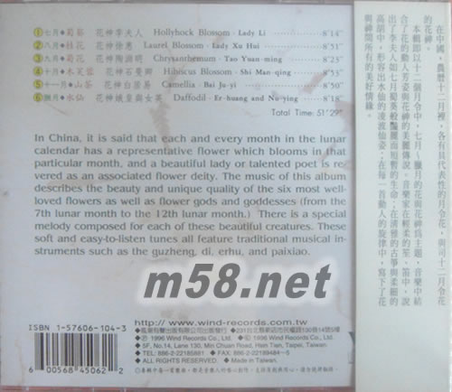 本輯即以十二個月令中,七月--臘月的花與花神為主題,音樂中結合了花的動人芳姿與花神的美麗傳說。音樂家在輕柔的笙、笛中,說出了李夫人如七月蜀葵般艷麗而短暫的生命;在清雅的古箏與柔細的高胡中,形容出水仙的凌波仙姿;在每一首動人的旋律中,寫下了花與神間所有的美好情緣。