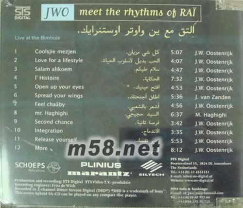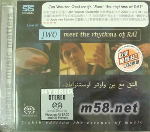 JWO / Meet the Rhythms of RAI SACD(m58.net) jan wouter oostenrijk"meet the hythms of rai" 阿拉伯著名吉他手jan wouter oostenrijk與其樂隊組合2003年3月31日在荷蘭阿姆斯特丹作首度現場演出.11首自憶創作另加上一首傳統歌曲.樂隊中女主音Josie van zanden美玉動人之歌聲使聽者融入接受明白東西音樂交流之理.