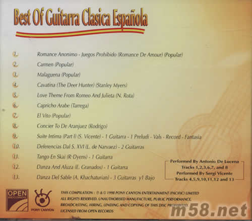 價格為估,以實到貨為準! 西班牙吉它古典精選(m58.net) 西班牙結他曲精選 無敵發燒試音碟王 1。ROMANCE DE AMOUR 2。名曲卡門CARMEN 4。電影[獵鹿者]主題曲CAVATINA 5。電影[殉情記]主題曲ROMEO AND JULIET