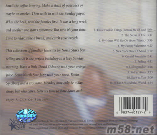 價格為估,以實到貨為準! 一天慵懶A CUP OF SUNDAY(m58.net) 一天慵懶 美國發(fā)燒品牌NORTH STAR(北極星)2000年最新消閑精選,樂手陳容包括美國總統(tǒng)御用鋼琴圣手——大衛(wèi)奧士邦、鋼琴艷女——史畢堡、色士風(fēng)/木結(jié)他給合——共同地帶、北極星公司精英樂隊THE NORTH STAR ENSEMBLE等等,全部改編數(shù)十年來遠近流行名曲如著名電影[鐵達尼號]、BILLY JOEL ,CAROL KING ,NAT KING COLE及JAMES TAYLOY