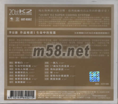 作品精選1生命中的精靈(K2系列日本版)(m58.net) 本專(zhuān)輯採(cǎi)用日本JVC 20-BIT K2超級(jí)編碼技術(shù)處理 現(xiàn)在你無(wú)需百萬(wàn)音響,依然能擁有高品質(zhì)的聆聽(tīng)享受!! 20-BIT K2 SUER CODING SYSTEM 由日本JVC獨(dú)家開(kāi)發(fā)之技術(shù),揚(yáng)棄一般CD[將原始盤(pán)帶轉(zhuǎn)成數(shù)位母帶,再以數(shù)位母帶制CD]的制作步驟,採(cǎi)用20-BIT,128倍取樣模擬/數(shù)位的轉(zhuǎn)換技術(shù),將原始盤(pán)帶之類(lèi)比訊號(hào),直接編碼制作成CD,可以防止一般CD制作過(guò)程之訊號(hào)損失.而20-BIT高密度編碼,擷取訊號(hào)數(shù)量是一般16-BIT CD的16倍!完整保留低頻訊號(hào)原貌,并減少CD最不被滿意之?dāng)?shù)位訊號(hào)間隙,使音質(zhì)更加圓潤(rùn)細(xì)膩.