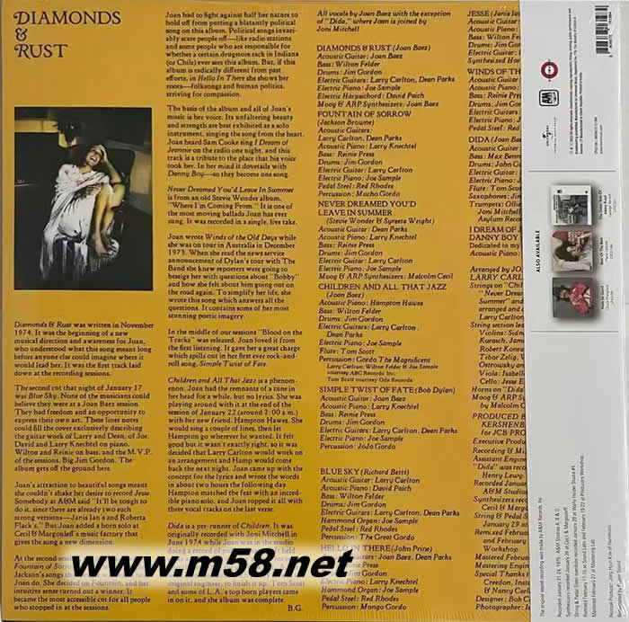 民謠 DIAMONDS & RUST 鉆石的璀璨 黑膠(m58.net) 975年,加盟A&M唱片公司的瓊拜雅推出了Diamonds & Rust專輯,在主流市場(chǎng)上獲得了相當(dāng)大的成功。這張CD成為了TAS名盤之一。專輯的標(biāo)題歌曲,Diamonds and rust,被認(rèn)為是Joan Baez最出色的一首歌曲之一,是她自己的作品,這首曲子是以Baez和Dylan當(dāng)年亦師亦友的感情為主軸描寫的一段Joan自己的感情,歌詞或可說晦澀但卻蘊(yùn)含真情。很多人以為他們倆將會(huì)舊情復(fù)燃,不過兩人只是再度同臺(tái)演出了一次,進(jìn)而激發(fā)了她完全自己譜寫的‘Gulf Winds’專輯。從此之后,她的創(chuàng)作逐漸多元化,經(jīng)常出現(xiàn)令人意外的新方向。