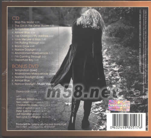 1、STOP THIS WORLD 2、THE GIRL IN THE OTHER ROOM 3、TEMPTATION 4、ALMOST BLUE 5、I‘VE CHANGED MY ADDRESS 6、LOVE ME LIKE A MAN 7、I‘M PULLING THROUGH 8、BLACK CROW 9、NARROW DAYLIGHT 10、ABANDONED MASPUERADE 11、I’M COMING THROUGH 12、DEPARTURE BAY BONUS DVD 1、TEMPTATION(LIVE) ABANDONED MASQUERADE(LIVE) 3、NARROW DAYLIGHT(LIVE) 4、ALMOST BLUE 5、NARROW DAYLIGHT(MV) DIANA KRALL ANTHONY WILSON NEIL LARSEN CHRISTIAN MCBRIDE JOHN CLAYTON PETER ERSKINE JEFF HAMITON TERRI LYNE CARRINGTON