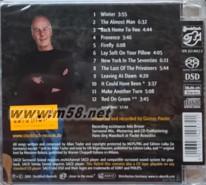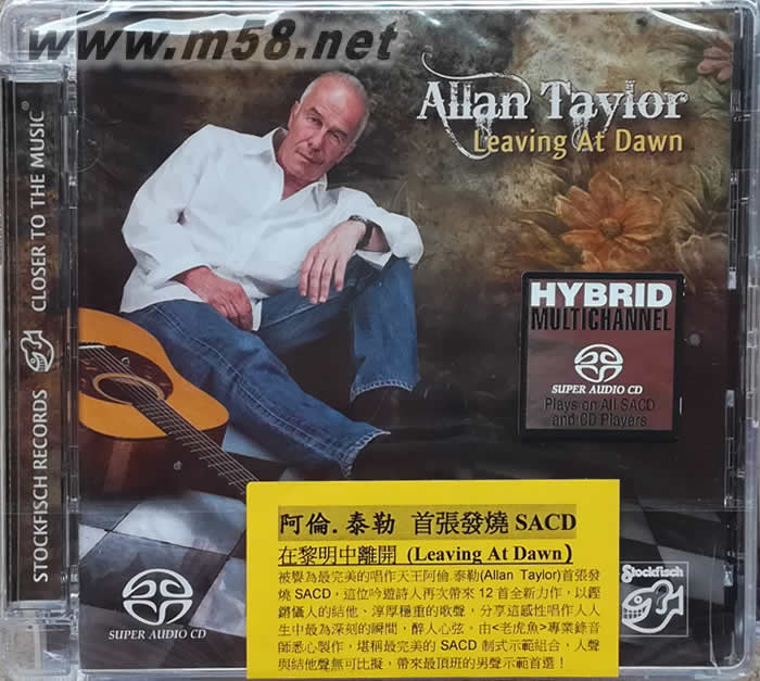 阿倫 泰勒 Leaving at Dawn 在黎明中離開 SACD(m58.net) 阿倫泰勒首張發(fā)燒SACD 被譽為最完美的唱作天王阿倫.泰勒(Allan Taylor)首張發(fā)燒SACD專輯[在黎明中離開(Leaving At Dawn)],這位吟游詩人再次帶來12首全新力作,以鏗鏘懾人的結他、淳厚穩(wěn)重的歌聲與你回顧他所懷念的地方、時刻、故事、經歷時代的風霜等,分享這感性唱作人人生中最為深刻的瞬間,醉人心弦。由<老虎魚>專業(yè)錄音師悉心制作,堪稱最完美的SACD制式示范組合,人聲與結他聲無可比擬,帶來最頂班的男聲示范首選!特別推薦:[為你而歸家(Back Home To You)]、[螢火蟲(Firefly)]、[70年代的紐約(New York In The Seventies)]、[在黎明中離開(Leaving At Dawn)]及[翠綠上的嫣紅(Red On Green)]等。