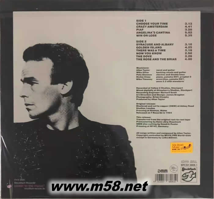 模擬的魅力「黑珍珠」系列第六輯 贏與輸 [Win or Lose] Analog Pearls Vol. 6 黑膠(m58.net) 1. 被譽(yù)為吟游詩(shī)人及完美唱作天皇的阿倫.泰勒(Allan Taylor)以其沉實(shí)雄渾,感性中帶著風(fēng)霜的聲線征服了無(wú)數(shù)樂迷,配合冼煉的歌唱技巧,被視為「發(fā)燒男聲」之翹楚,雄視樂壇超越五十年。 2. 泰勒與發(fā)燒錄音名牌「老虎魚(Stockfisch Records)」合作達(dá)二十五年,共同創(chuàng)造出多個(gè)使樂迷津津樂道的經(jīng)典專輯,是高質(zhì)素美樂錄音的保証。泰勒在其音樂旅程穩(wěn)定基石后的初期,曾於一九八四年親自以模擬錄音方式(analog recording)製作專輯《Win Or Lose (贏取或輸?shù)?》,在當(dāng)時(shí)出版后無(wú)論是歌曲的動(dòng)聽性,他唱功的表現(xiàn)和錄音效果皆獲得好評(píng)如潮。他為了與「老虎魚」的合作達(dá)入新的里程碑,與錄音大師古達(dá)‧普勒(Günter Pauler)商討,由泰勒提供這專輯的原裝模擬母盤,而普勒採(cǎi)用最新的技術(shù)和器材加以復(fù)修和改良使整體音效得以提升后再作出版,使更多樂迷能有機(jī)會(huì)欣賞泰勒在風(fēng)華正茂時(shí)令人回味無(wú)窮的歌聲和令人讚嘆不已的指彈技術(shù)。 3. 專輯內(nèi)的十一首歌曲全是泰勒的精心杰作,由他親自演繹更為傳神,配合多位當(dāng)時(shí)能獨(dú)當(dāng)一面的音樂人絲絲入扣的演奏緊密地配合,每首樂曲皆以賞心悅耳的形態(tài)展現(xiàn),將他獨(dú)有的魅力詮釋得淋漓盡致。 4. 普勒製作的母盤使原有音色得以保存時(shí)亦加以潤(rùn)飾,無(wú)論是人聲或樂器聲的原來(lái)音色得已原汁原味地寄存。現(xiàn)以金屬直刻母盤(Direct Metal Master),180克處女黑膠盤為載體,原來(lái)音源的模擬音色更為清麗飽滿,樂器音質(zhì)厚實(shí),線條分明,人聲細(xì)致真實(shí),是愛好聆聽模擬錄音者另一必備之選。